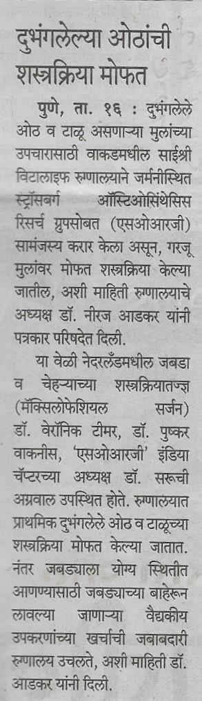 साईश्री विटालाईफ हॉस्पिटलचा जर्मनीच्या एसओआरजी संस्थेशी सहकार्य दुभंगलेल्या ओठांच्या मोफत शस्त्रक्रियेबाबत सीएसआर उपक्रमाला जर्मन तंत्रज्ञानाचे पाठबळ https://www.facebook.com/reel/802920769463747